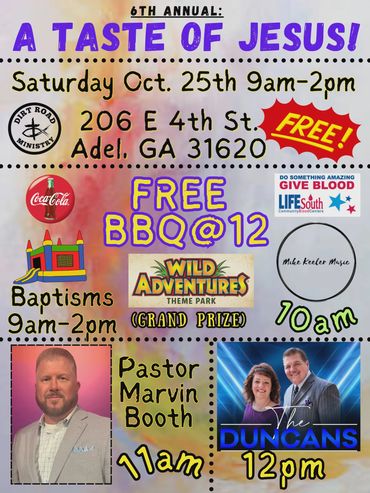 Pastor Marvin Booth preaching THE REVELATION OF JESUS on the streets of Adel Georgia during a 6th Annual "A TASTE OF JESUS FESTIVAL", sponsored by "Dirt Road Ministry". Souls were saved and baptized in water immediately thereafter! To Jesus Be All The Praise! Recorded LIVE on (October 25th, 2025).